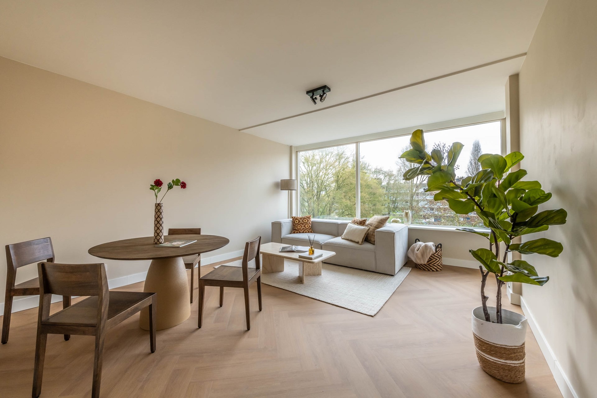 De woonkamer is met het grote raam heerlijk licht. Het licht valt vanwege de glazen openslaande deuren ook aangenaam binnen naar de centrale hal. Vanuit de woonkamer is er direct toegang tot het op het zuidwesten gelegen balkon, een fijne plek om buiten te zitten.